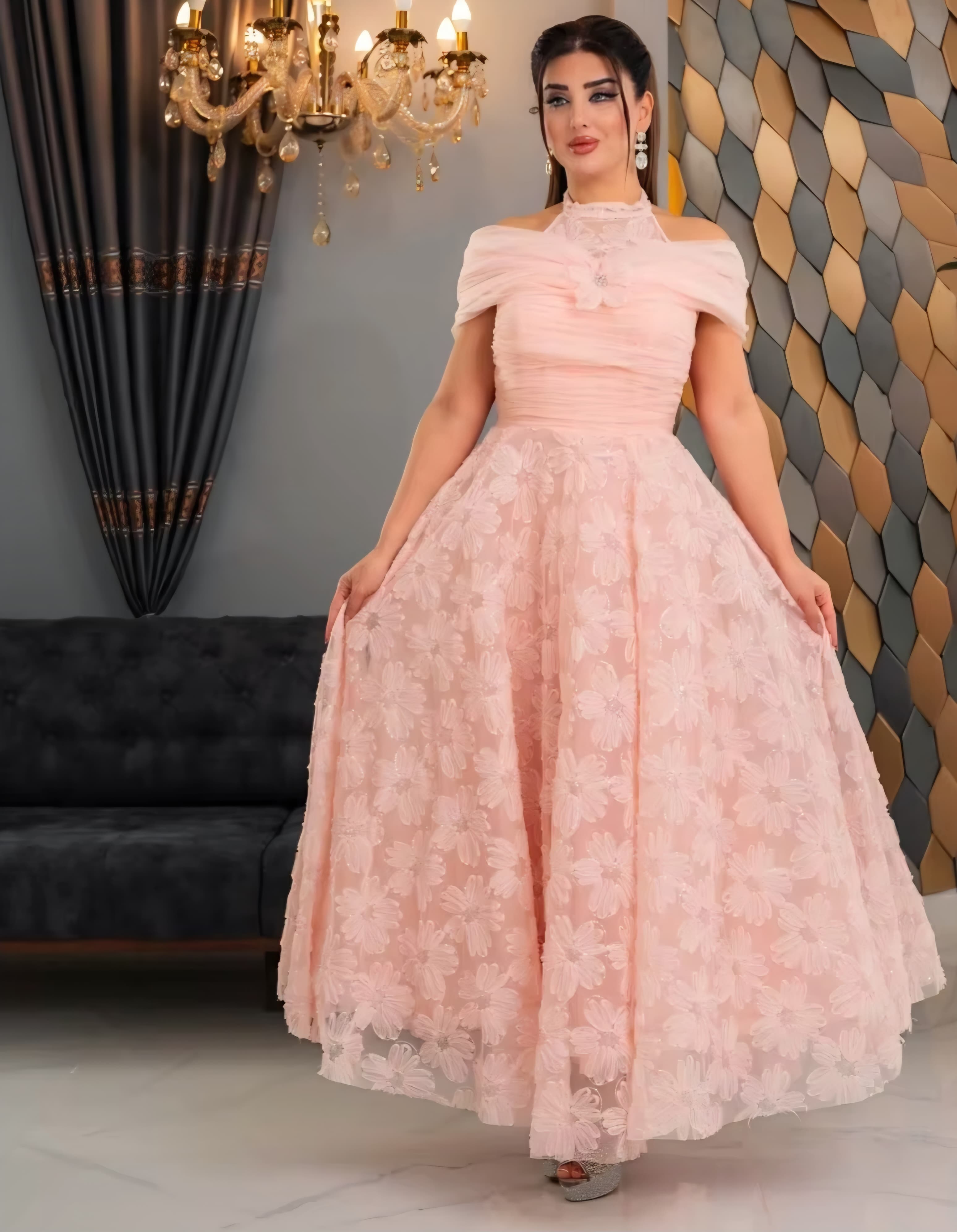 فستان أنيق باللون الوردي الفاتح، يتميز بقصّة ملكية واسعة من الأسفل مع طبقات تول مطرّزة بنقشات زهرية ناعمة. الجزء العلوي مصنوع من قماش شيفون مُدرَّج بطيّات رقيقة مع ياقة عالية وتفاصيل draping ناعمة على الكتفين، ما يمنحه مظهراً راقياً وأنثوياً مناسباً للمناسبات الفاخرة.✨
